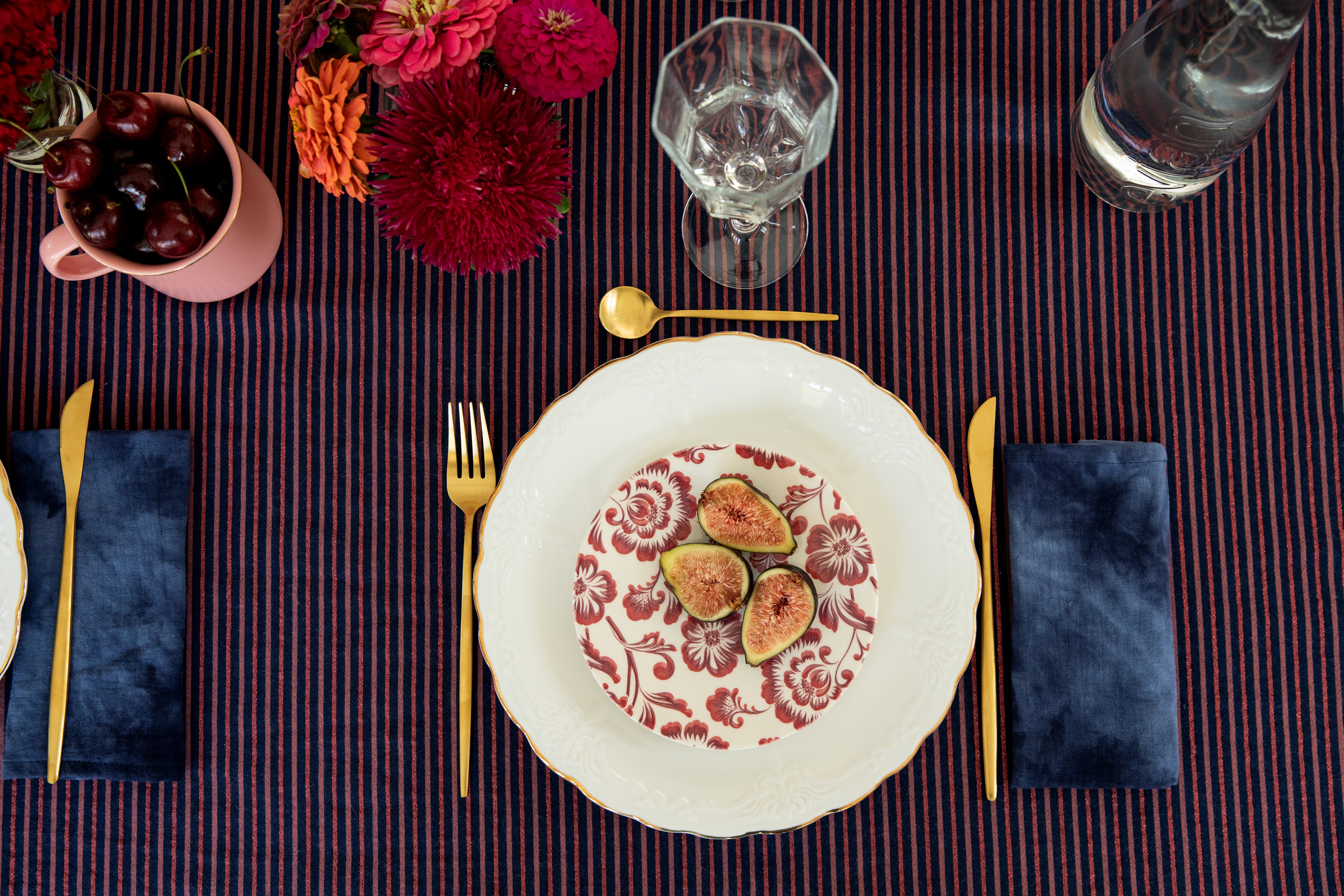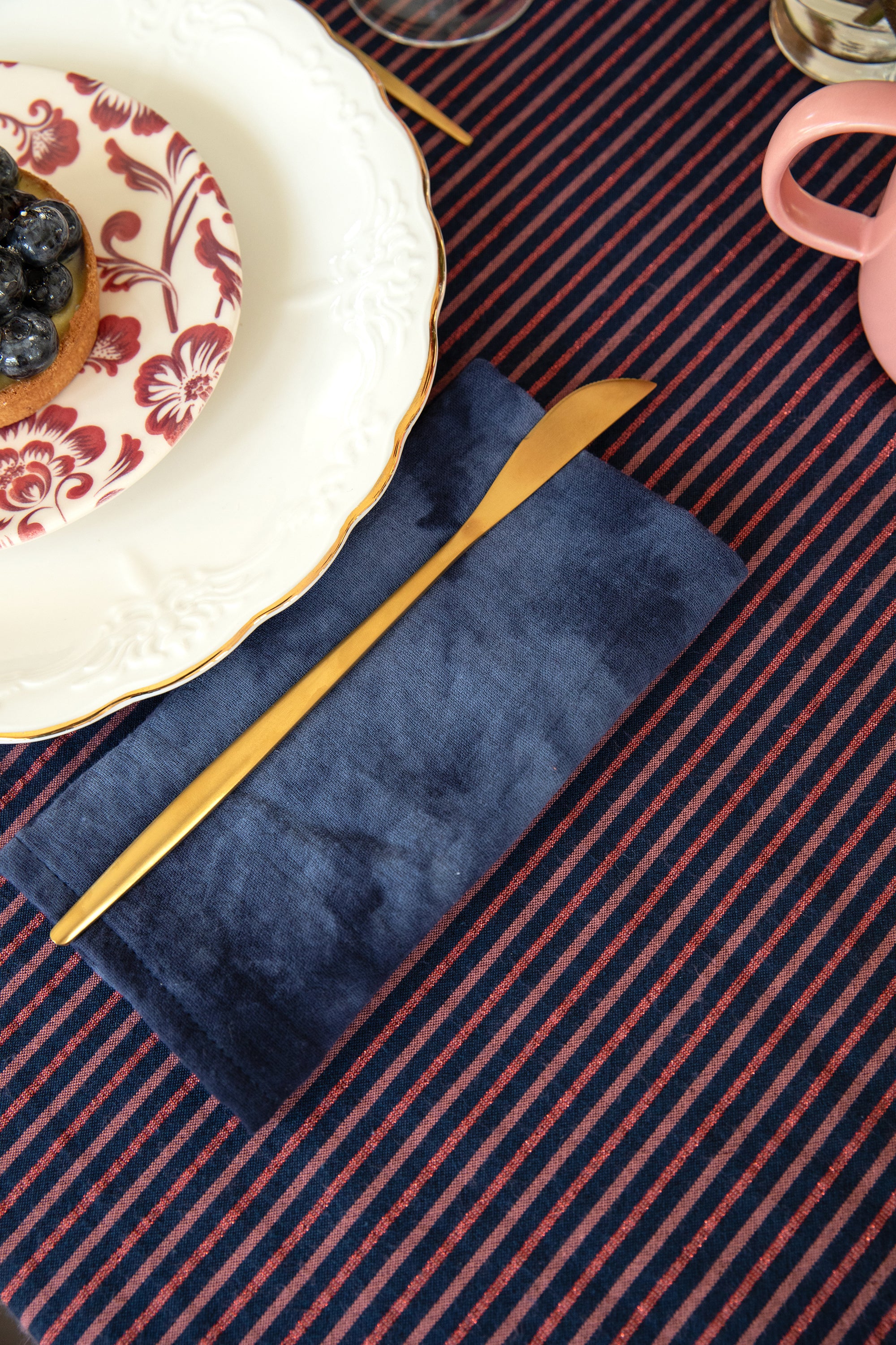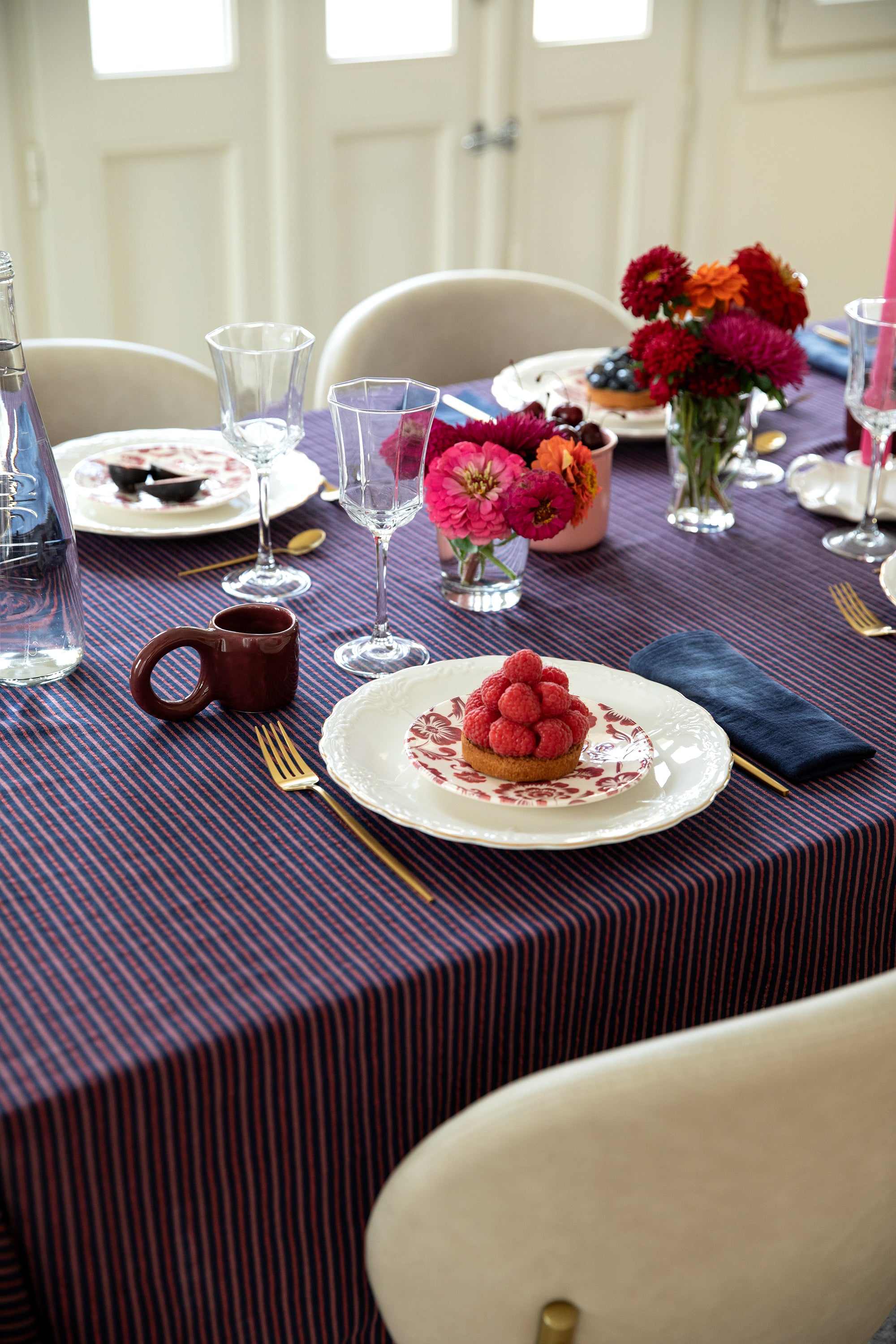 Table élégante et habillée d'une somptueuse nappe à rayures fines, dans des tons bleu marine, rouge et rouille, agrémentée d'un fil de lurex subtil apporte éclat, lumière et paillette à tous vos repas de fête ! Le jeu de rayures agrémenter de bouquets bas de fleurs rose et rouge mélangées donnent à la table une allure à la fois sophistiquée, raffinée et captivante, parfaite pour une ambiance accueillante.