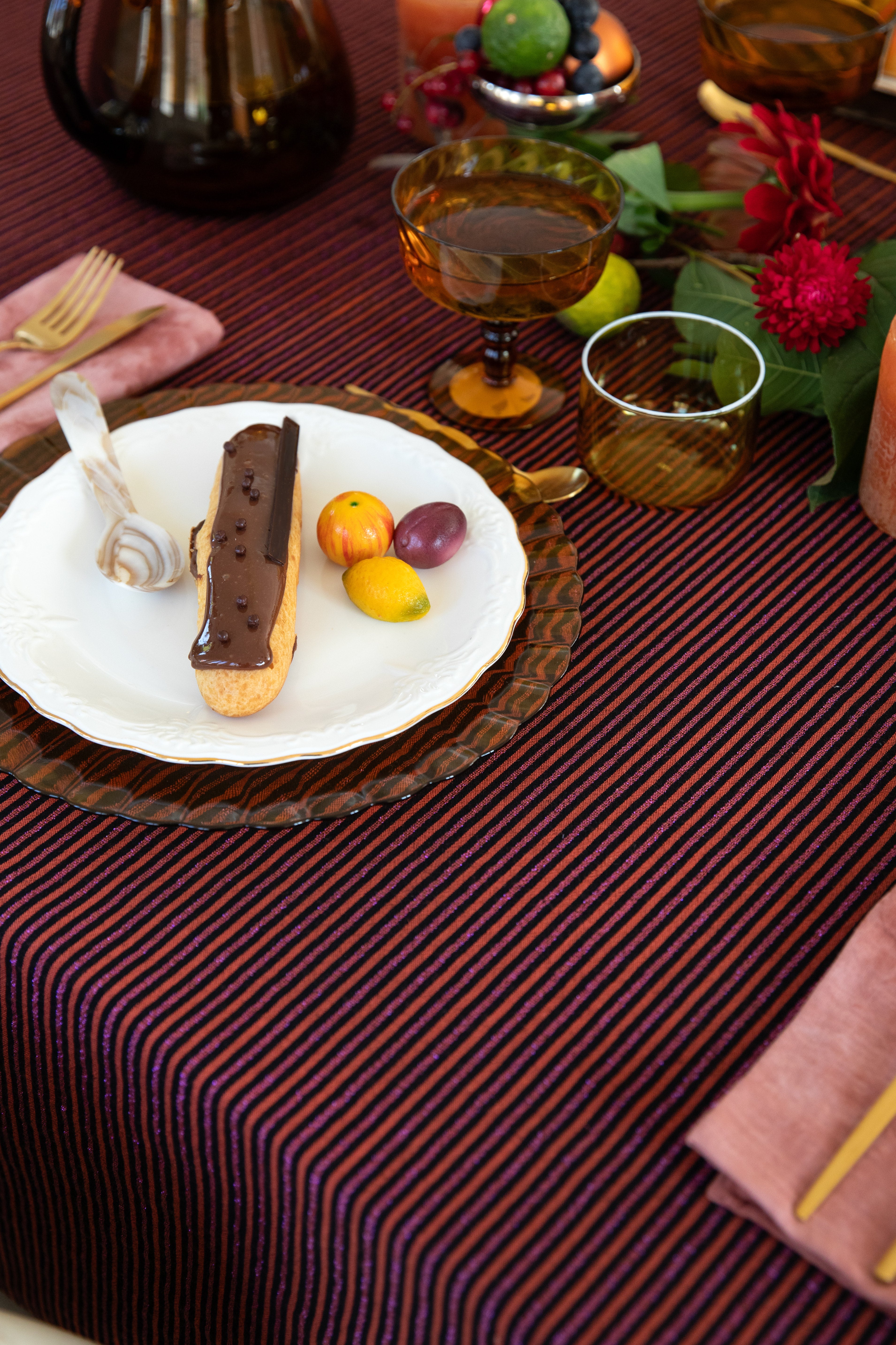 - Le couvert doré, soigneusement posé, reflète une subtile lumière automnale, apportant éclat et raffinement à cette ambiance conviviale. Les verres en cristal ambré créent une ambiance lumineuse, invitant à la détente et au partage.